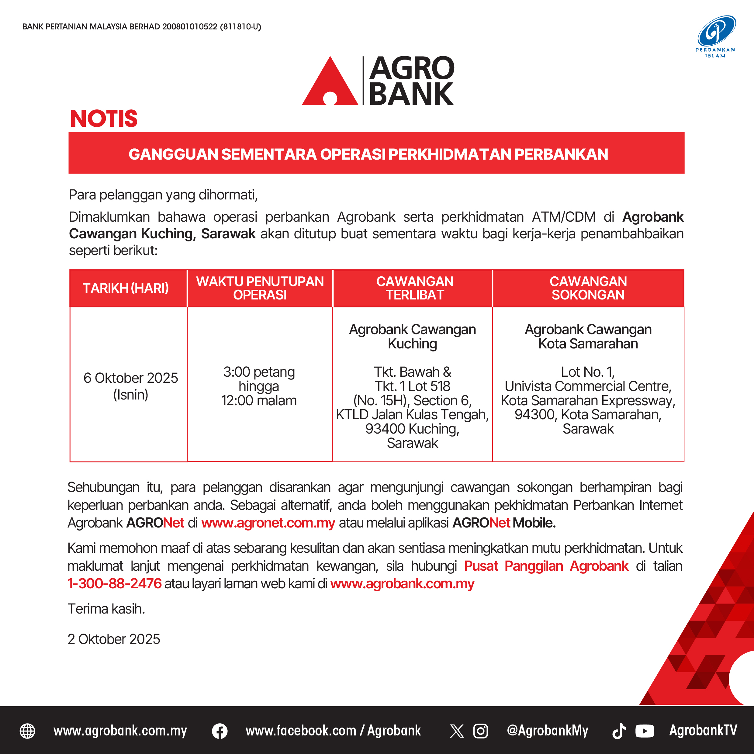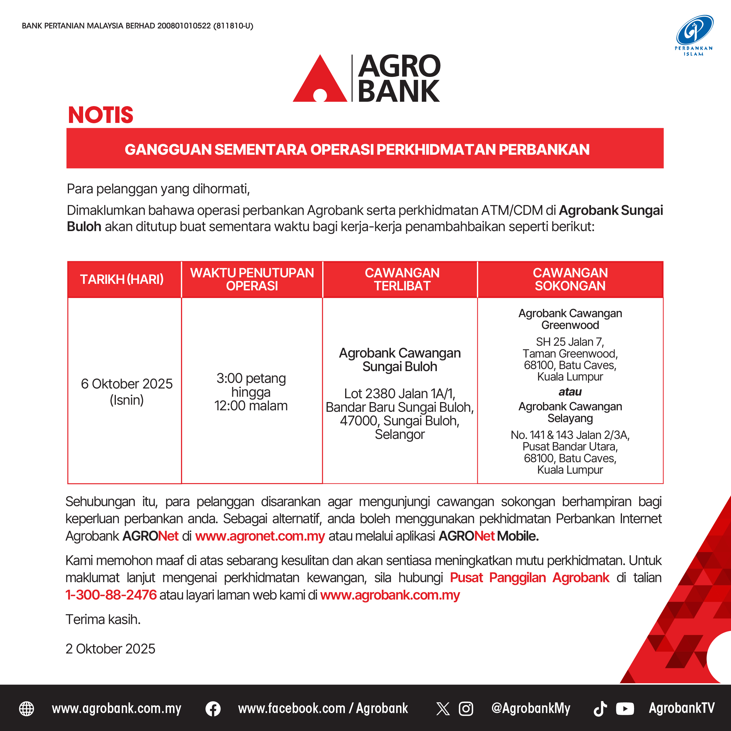 Notis Gangguan Sementara Operasi Perkhidmatan Perbankan (Penutupan 5 Cawangan)