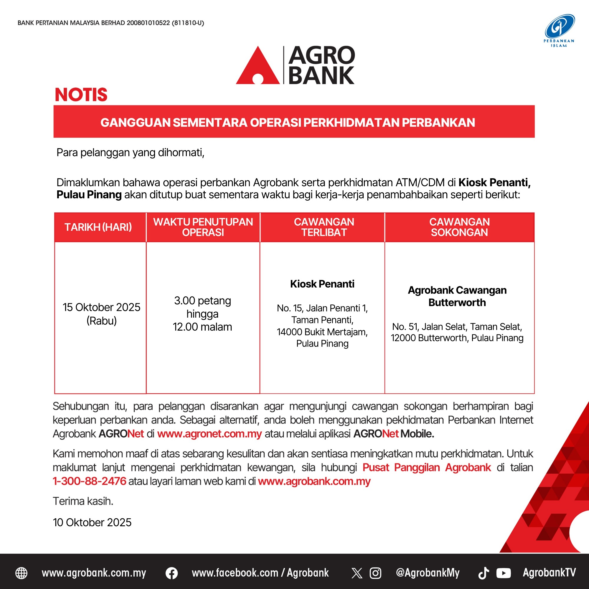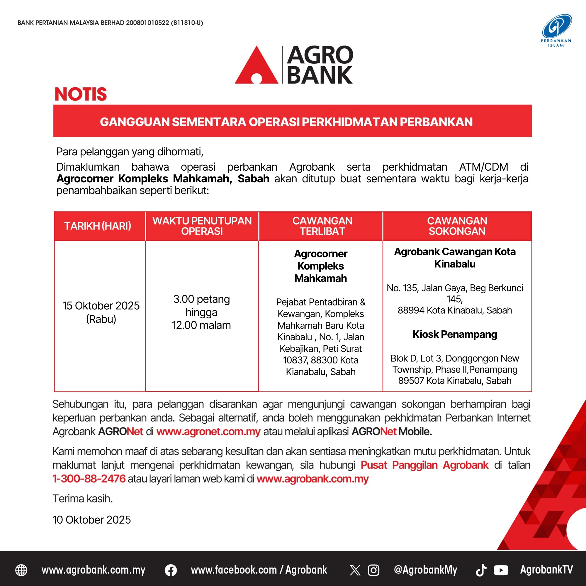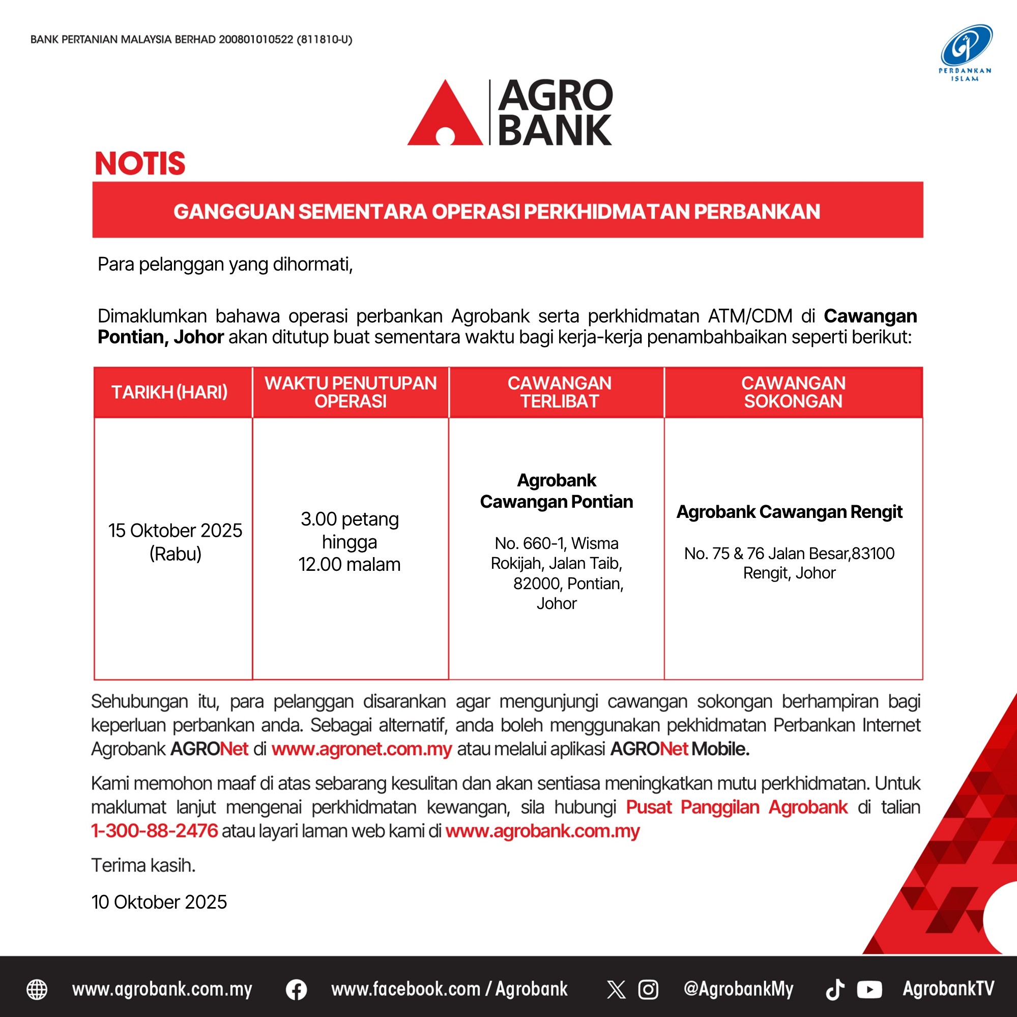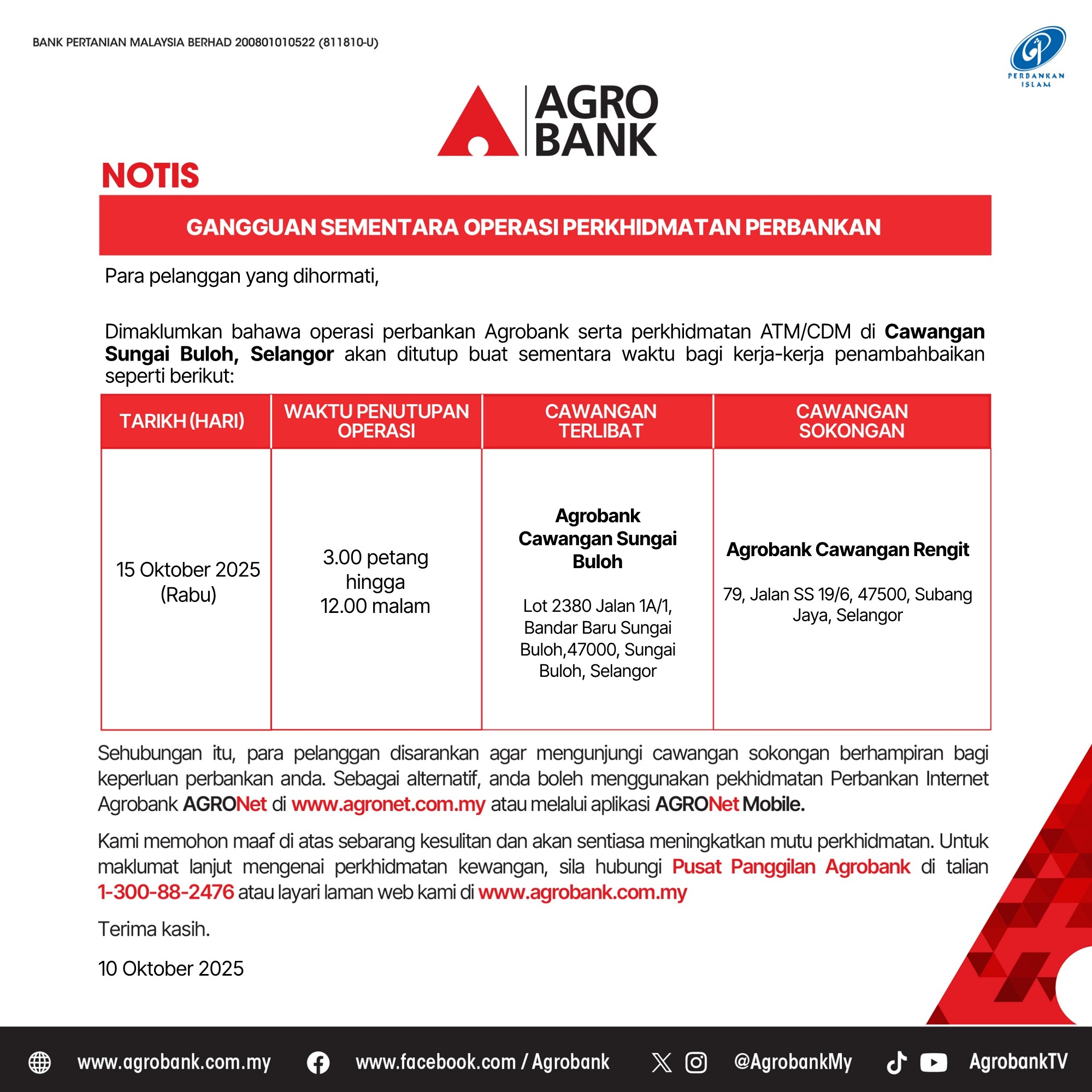 Notis Gangguan Sementara Operasi Perkhidmatan Perbankan (Penutupan 6 Cawangan)