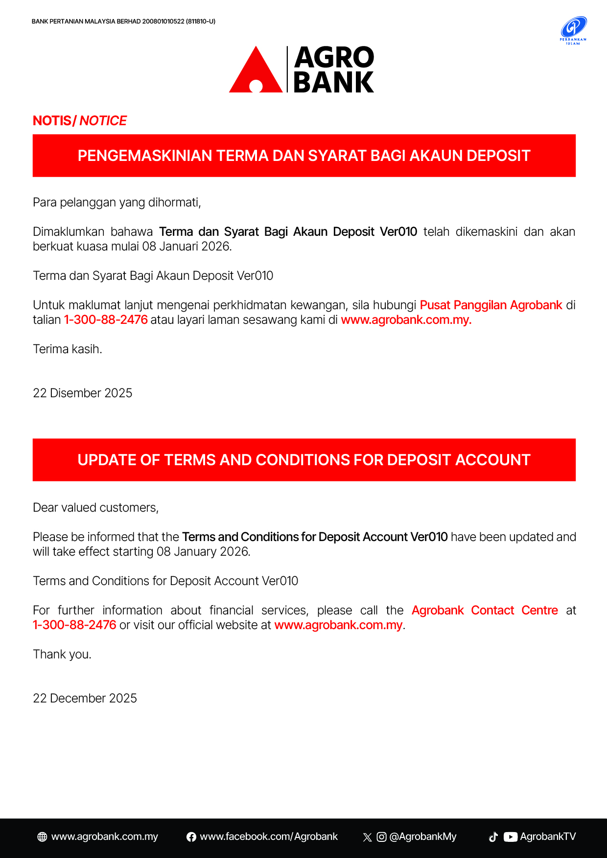 Pengemaskinian Terma dan Syarat bagi Akaun Deposit