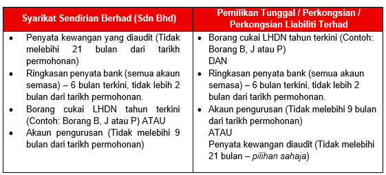 - Perniagaan mikro, kecil, dan sederhana (PMKS) seperti pemilikan tunggal atau perkongsian liability terhad, atau Sdn Bhd dengan 51% saham milik warganegara Malaysia.