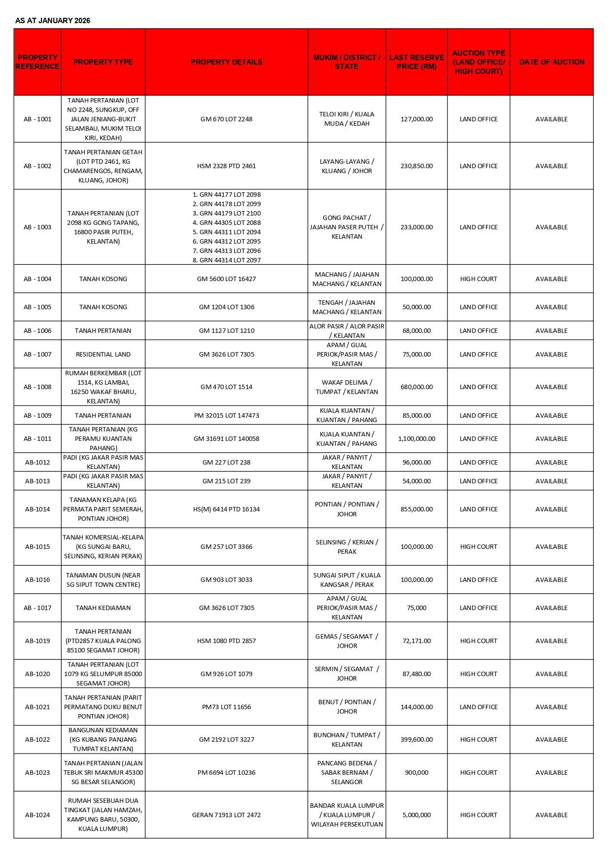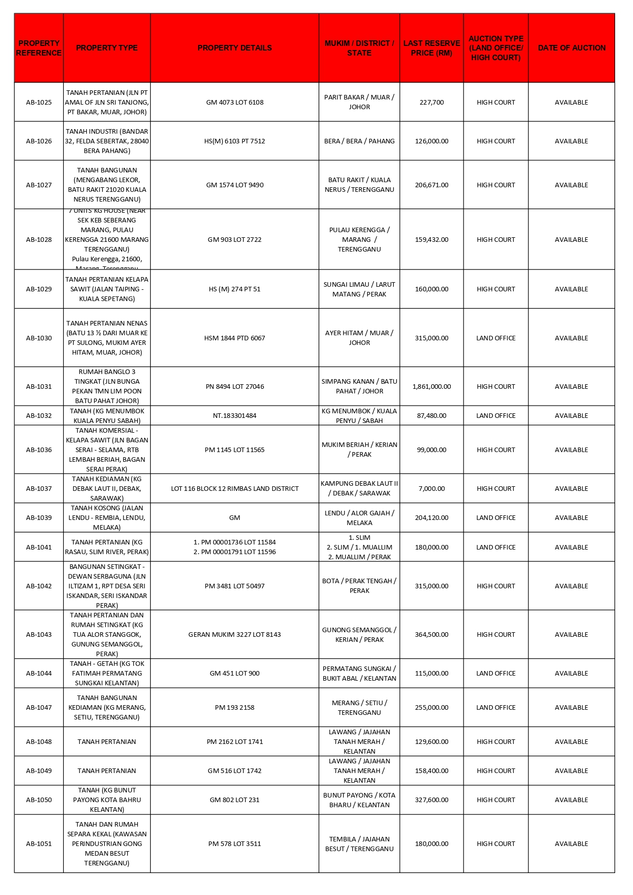 Enquiries are welcomes. Kindly email auction@agrobank.com.my or contact 03-2731 1600 (extension 1023 / 2634).